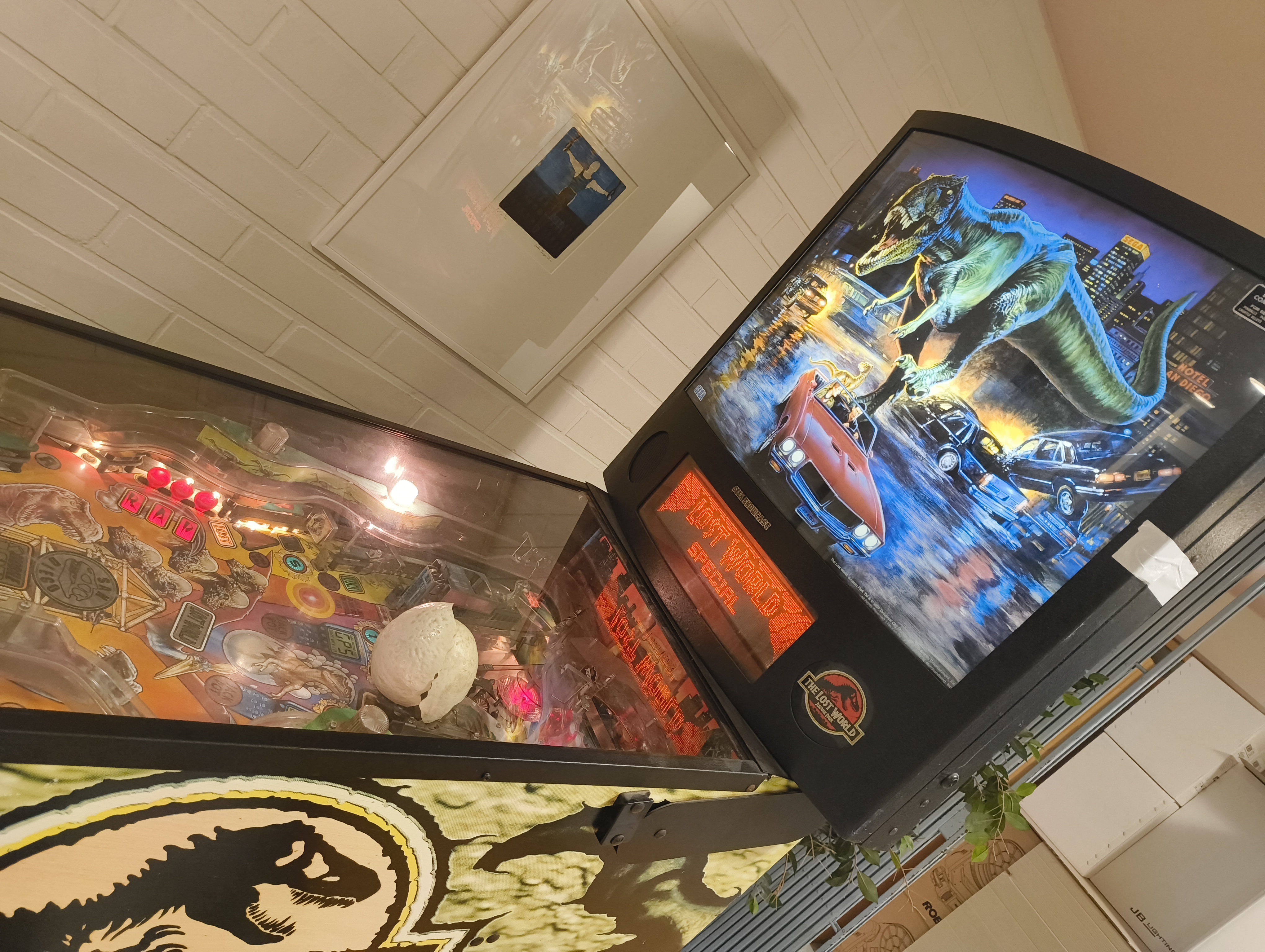 Instanssisuosikki Jurassic Park -flipperi peluuttaa ja ilahduttaa sulosoinnuillaan aivan pääsalin ovien ulkopuolella.